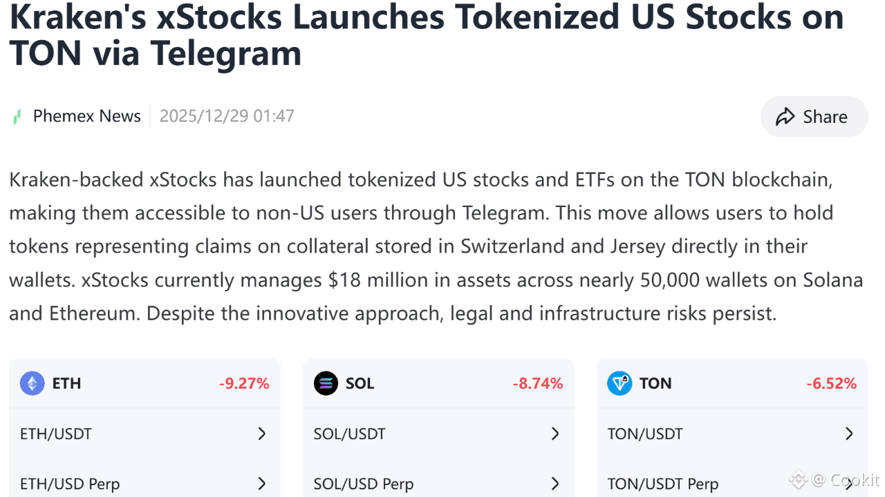 经了解,Telegram实现该功能主要通过xStocks接入了TON区块链。其逻辑基于常见的区块链技术:链上资产发行、预言机获取股价、多链流通以及DeFi的可组合性。Telegram由此成为首个将股票交易融入聊天界面的应用。