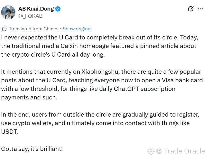 Users in China are increasingly sharing tips on how to get “U cards” — overseas Visa/Mastercards linked to stablecoins like USDT — on platforms like Xiaohongshu (Little Red Book). These cards let people spend dollar-pegged stablecoins without breaking China’s strict crypto ban 🛑 on trading & payments. Merchants receive regular fiat, while the crypto part stays offshore — a clever workaround that’s going viral! 📈🔥�