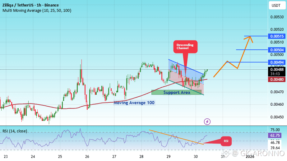 There is a key support zone in green at 0.00470. The price has bounced from this zone multiple times and is expected to bounce again.