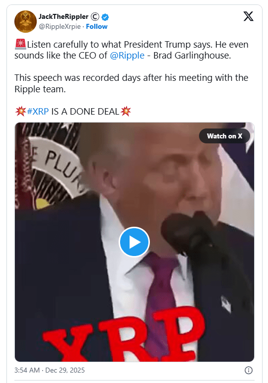 Timpul joacă un rol central în narațiune. Trump s-a întâlnit cu echipa Ripple înainte de a face aceste observații. JackTheRippler tratează această secvență ca fiind relevantă. El sugerează că întâlnirea a oferit context care a apărut ulterior în discursul lui Trump. Notabil, acest discurs a venit la scurt timp după ce XRP a atins cel mai mare nivel din toate timpurile de 3.65 USD, alimentând și mai mult credința lui JackTheRipper într-o legătură.