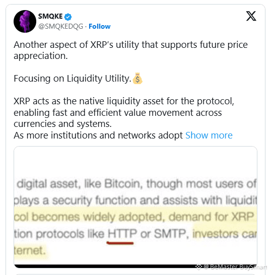 SMQKE stated that XRP “acts as the native liquidity asset for the protocol, enabling fast and efficient value movement across currencies and systems.” He connected this role to institutional usage. His post explained that as more institutions connect to the network, liquidity demand rises by design.