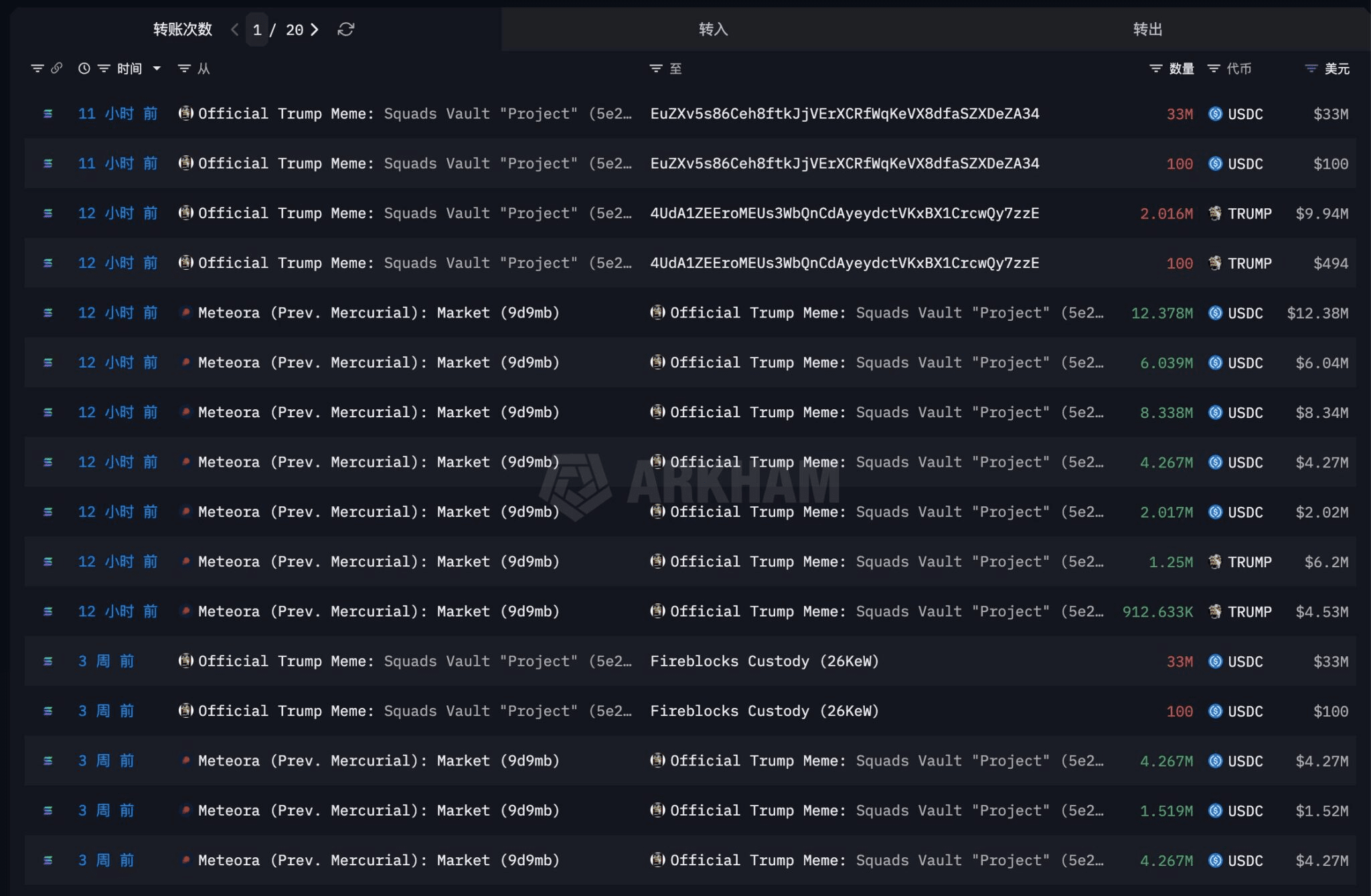 TRUMP Coin s-a confruntat mult timp cu presiunea din partea unor portofele mari despre care se crede că sunt legate de echipă. Aceste portofele au depus în mod repetat sume substanțiale de tokeni pe burse în valuri. În mai, trackerii on-chain au semnalat un singur transfer de 3,5 milioane de tokeni—în valoare de aproximativ 52,6 milioane de dolari la acea vreme—trimis către burse centralizate într-o singură mișcare.