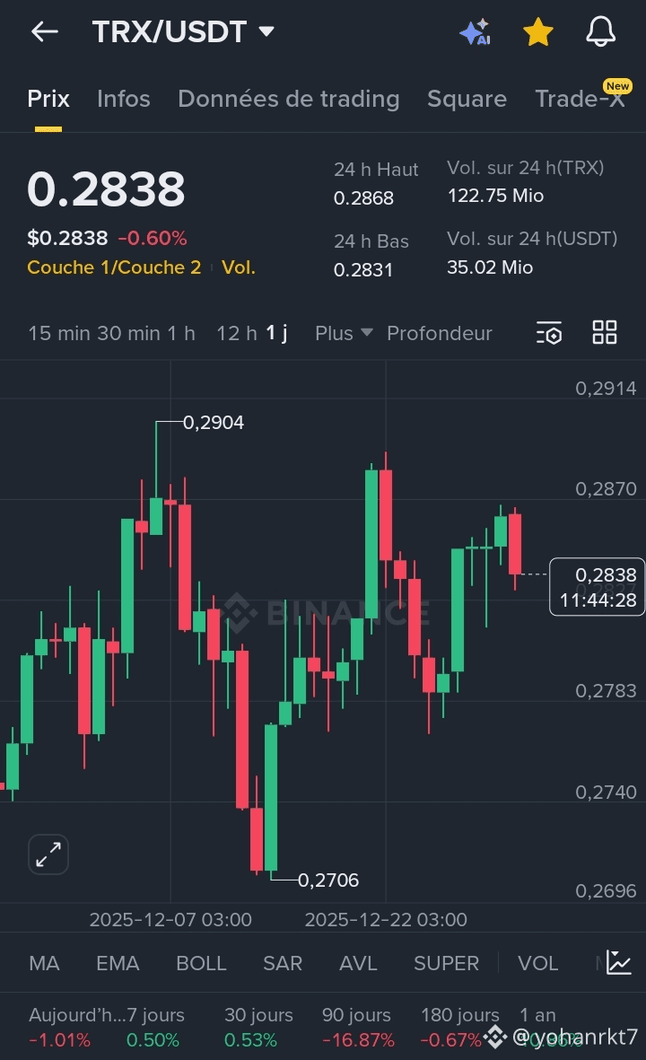 * Prix Actuel : Le TRX se négocie à 0,2838 $, montrant une légère correction de -0,60 % sur les dernières 24h.