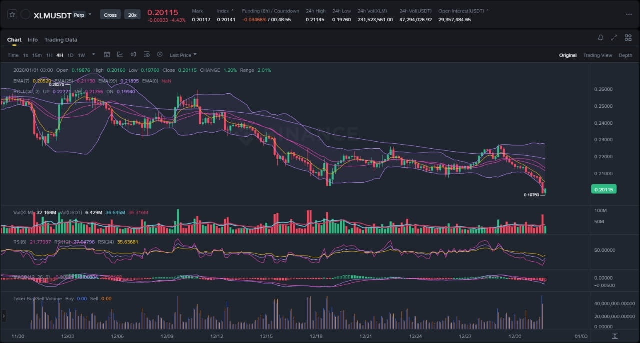 The XLMUSDT perpetual contract is currently exhibiting clear bearish characteristics on the 4-hour timeframe. The market has transitioned from a low-volatility compression phase, evident by the tightening of the Bollinger Bands, into a distribution phase marked by a sharp, impulsive sell-off. This move has established a new local low, breaking the preceding market structure and suggesting that sellers are currently in control of the order flow. The increase in trading volume accompanying this downward move lends credibility to the breakdown, indicating a degree of market consensus behind the new direction.