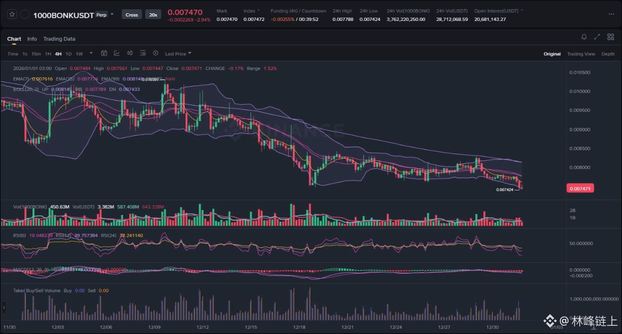 A granular analysis of the 4-hour chart for 1000BONKUSDT reveals a market structure that is, by technical definition, bearish to neutral. The overarching structure is a clear downtrend established after the decisive rejection from the cycle highs posted in early December. This is technically defined by a consistent, textbook series of lower swing highs and lower swing lows, the very definition of a bearish trend. The current period of sideways action, which began around December 18th, is best interpreted as a pause, a consolidation, or potentially the formation of a bearish continuation pattern, such as a bear flag or pennant, within this larger bearish framework.