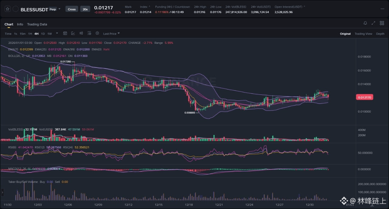 The 4-hour chart for BLESS/USDT provides a clear narrative of the asset's recent performance. The period leading into December was defined by a distinct and persistent downtrend. This is evidenced by the series of lower highs and lower lows, with price consistently trading below key moving averages, which acted as dynamic resistance, capping any attempts at bullish rallies. This bearish phase culminated in a capitulation-style move around mid-December, where price found a local bottom near the 0.009900 level. This marked a critical inflection point. Following this low, the aggressive selling pressure abated, and the market structure shifted from a clear downtrend into a sideways consolidation range. For the latter half of December, BLESS has been oscillating within this newly established range, demonstrating a state of temporary balance between buying and selling interest. This is a common market behavior following a strong directional move, as participants reassess valuations and await a new catalyst. The current price action is therefore best characterized as a horizontal range or a consolidation phase, where control is contested, and no clear directional bias has yet emerged from the equilibrium.