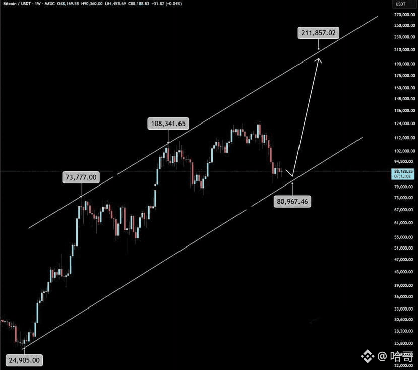 首先,这个图不是我画的,是一个KOL画的,图中认为会btc先回踩8万,再涨向20万。这类观点通常基于技术分析中的支撑阻力、形态结构等工具,有其分析逻辑。然而,市场走向具有高度不确定性,任何预测都只能作为参考,而非确定性结论。