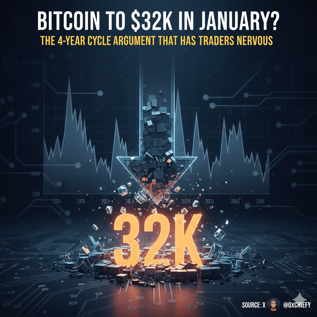 În acest context de oboseală a pieței, o analiză tehnică realizată de traderul Chiefy a câștigat teren. Teza sa sugerează că, dacă structurile istorice ale ciclurilor de 4 ani rămân valide, Bitcoin ar putea înfrunta o corecție semnificativă către nivelul de 32.000 $ până în ianuarie 2026.