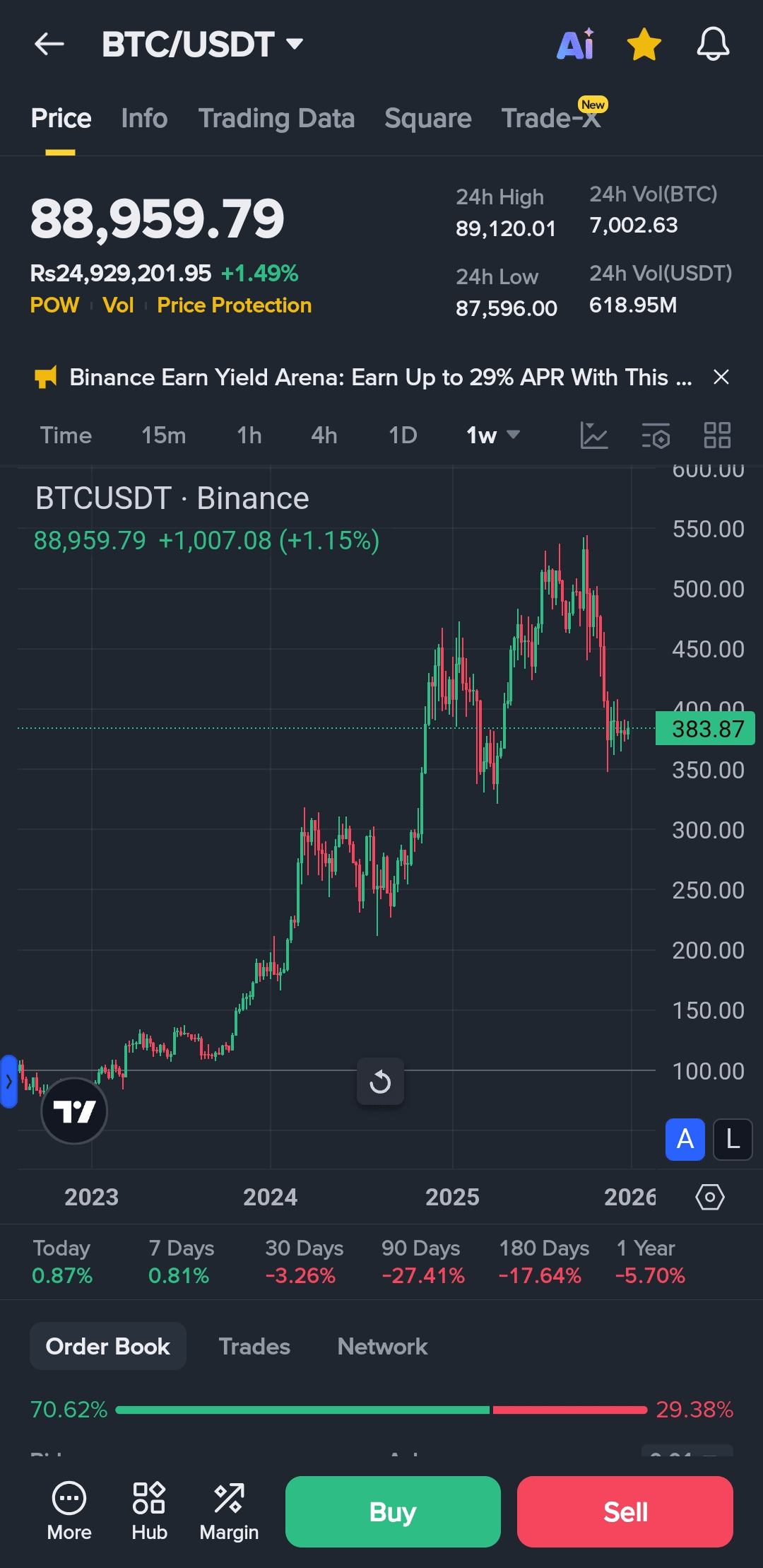 Prețul actual este în jur de 88,959 USDT, cu o gamă de 24 de ore între 87,596 și 89,120. Aceasta indică faptul că lichiditatea este încă prezentă, dar atât cumpărătorii, cât și vânzătorii acționează cu precauție. Lumânările roșii recente de pe grafic sugerează realizarea profitului pe termen scurt de către comercianți.