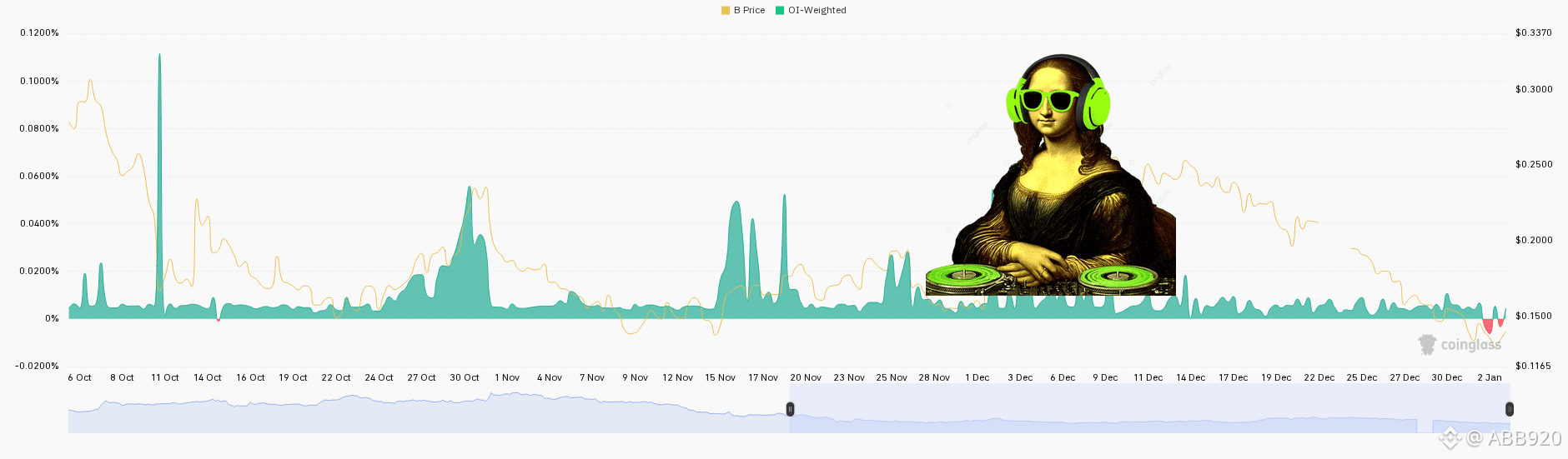 December, oh December. A dreadful descent below $0.20, then $0.15. The OI-Weighted chart through this period tells a tale of fading interest and declining liquidity, a slow bleed rather than a dramatic capitulation, save for that curious red dip in late December. Now, as we squint into early January, B is hovering just above the $0.11 level. The price looks like it's trying to catch its breath, but the overall OI-Weighted activity remains subdued. The absence of significant green spikes while price consolidates at these lows suggests a market holding its breath, waiting for a genuine spark, not just another feeble rally. Potential dead cat bounce territory if OI doesn't confirm any upward momentum. Tread carefully, gang.