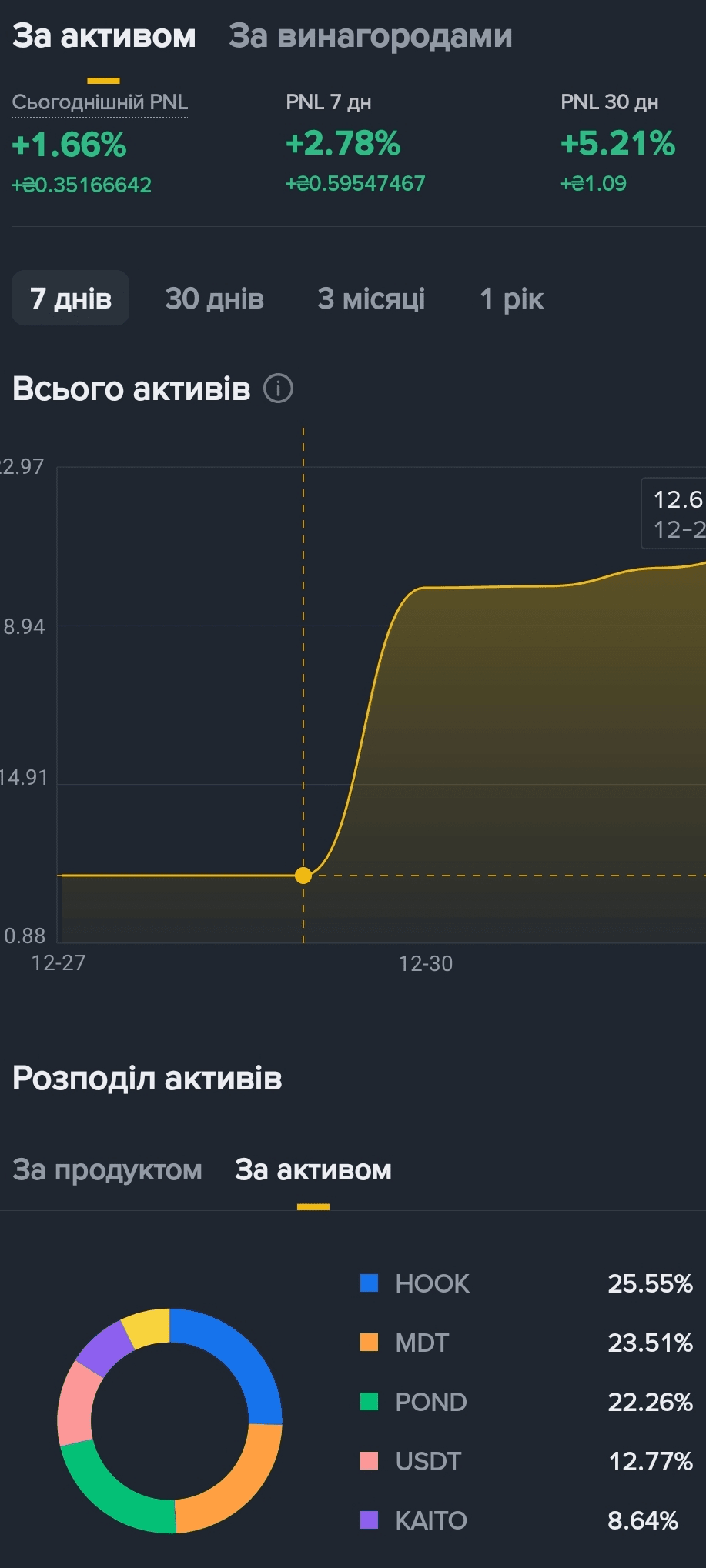Acum top-3-ul meu arată astfel: $HOOK (25.5%), $MDT (23.5%) și $POND (22.2%). Acest lucru îmi permite să nu depind de mișcarea unei singure monede.