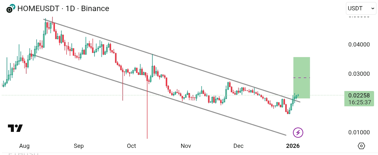 $HOME a fost tranzacționat într-un canal descendent curat timp de luni de zile 📉 și acum sparge linia superioară a tendinței cu o lumânare impulsivă puternică — structura spune că acesta nu este un pompare aleatorie, acesta este un încărcare de reversare 🦬.