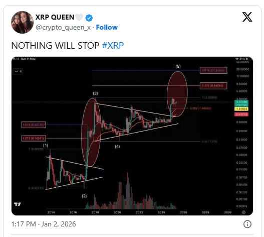 Graficul Reginei XRP suprapune extensiile Fibonacci pe valurile anterioare de expansiune. În ciclurile anterioare, prețul a atins extensiile 1.272 și 1.618 înainte de a atinge vârful. Aceste niveluri nu au acționat ca rezistență la început, dar au marcat etapele finale ale expansiunii.