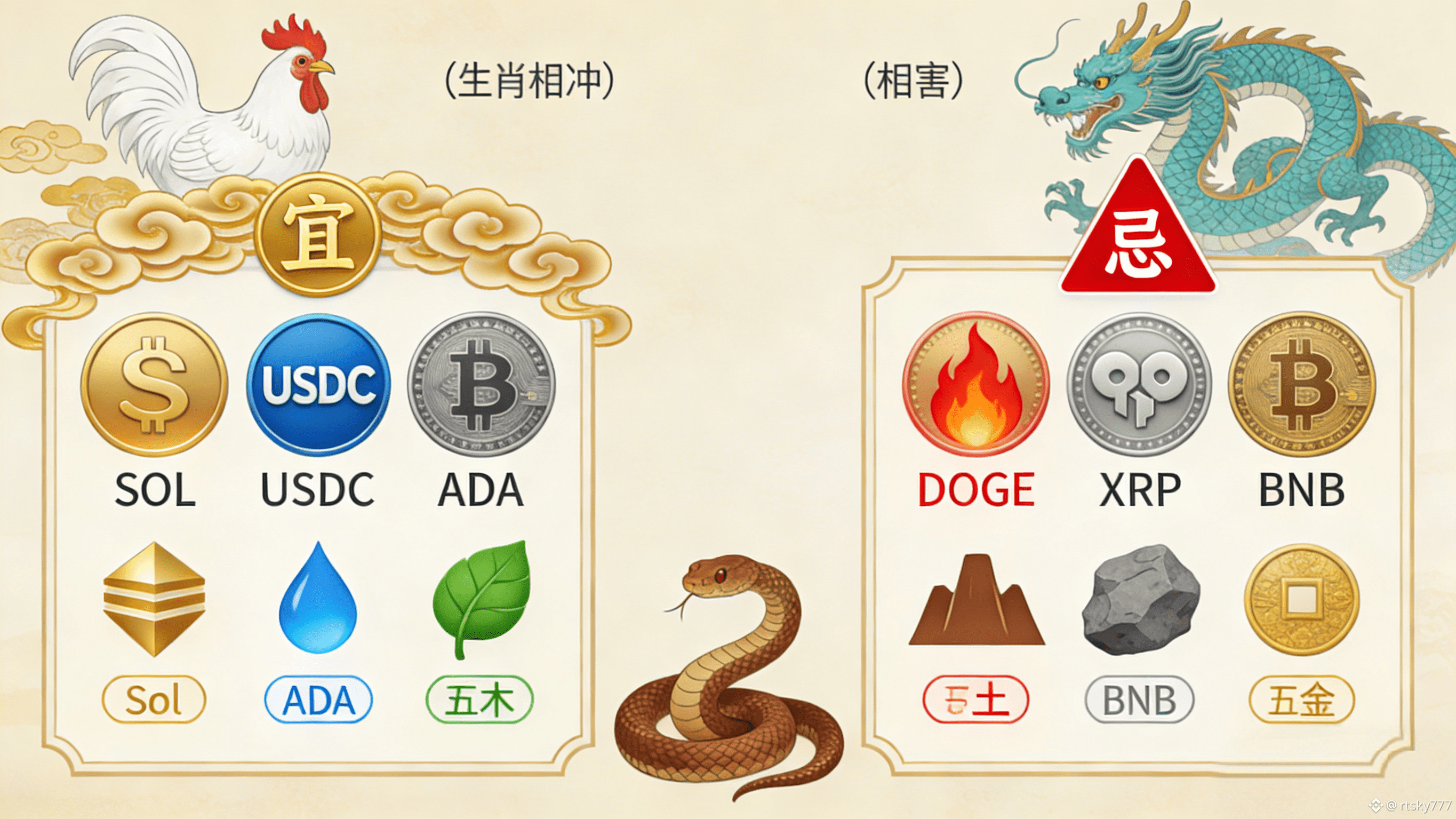 Dogecoin(DOGE):24H波动率极高,剧烈波动特性易受“冲鸡煞西”干扰,引发财富损耗,契合本日“忌投机冒进”的黄历警示。五行属木,木旺加重克土之势、破坏火土相生格局,尤其属鸡(当日相冲)的人群应坚决规避。