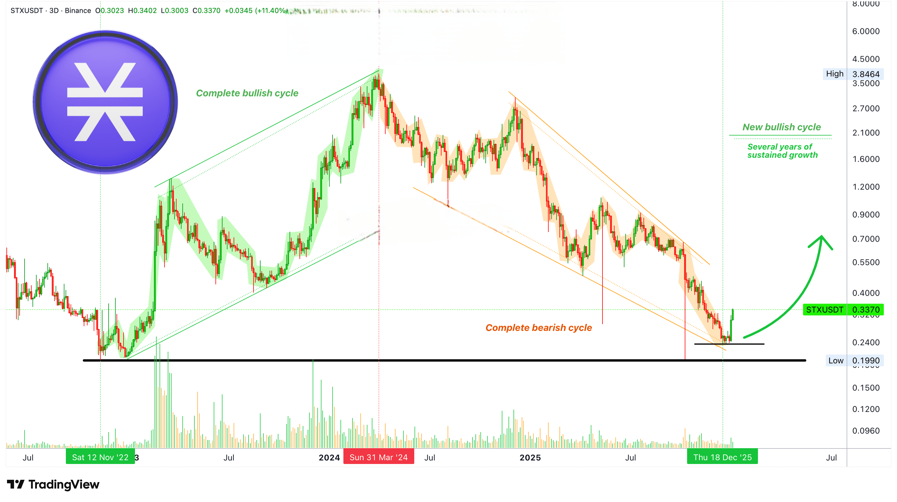 STXUSDT a format un minim mai ridicat recent și sesiuni săptămânale puternice verzi pentru a confirma minimul mai ridicat ca minim al ciclului de scădere. Minimul a avut loc pe 10 octombrie 2025, cu aproximativ trei luni în urmă. Este normal să observăm o mică mișcare ascendentă după trei luni de consolidare. Te-am avertizat.