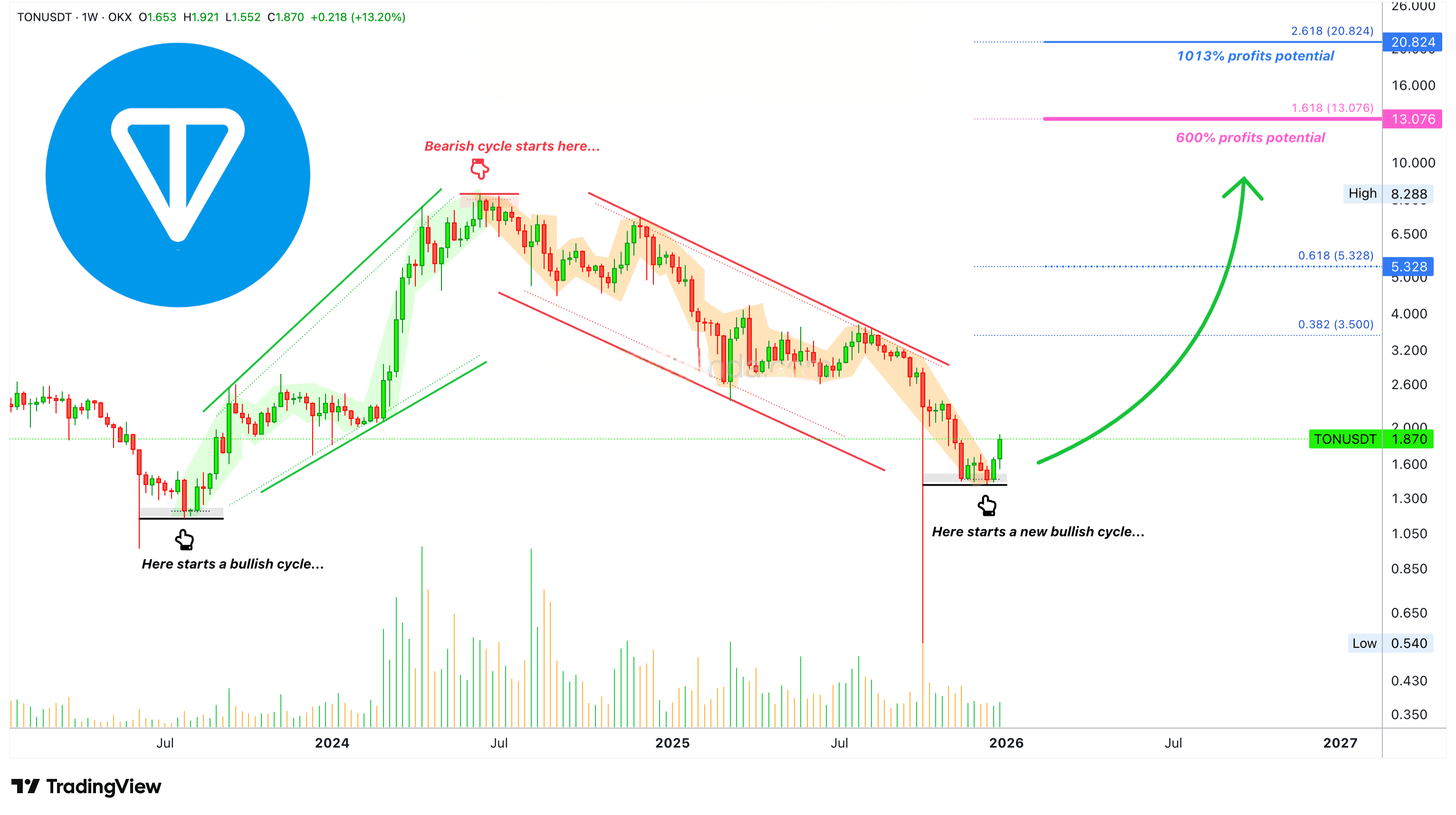 Indiferent de cât de mult se mișcă Toncoin pe termen scurt până la mediu, acum suntem pe o creștere!