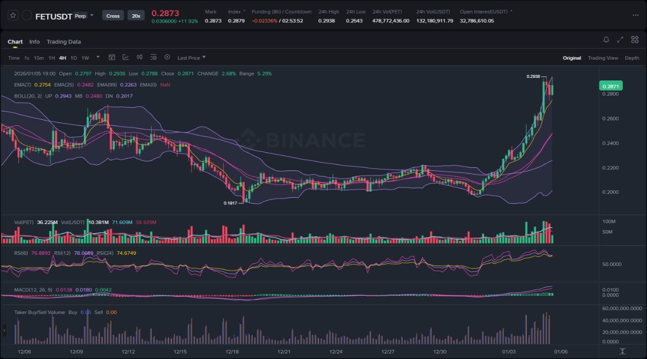 Cele mai recente știri se concentrează asupra a două teme principale: revenirea tehnică a prețului și inovațiile specifice proiectului în domeniul inteligenței artificiale. Prima temă, pozitivă pentru impulsul prețului, provine din raportul Blockonomi care arată o creștere de 20% a FET după o perioadă de tendință descendentă, stabilizându-se aproape de $0,26 în contextul unor schimbări în comportamentul pe termen scurt — un adevărat avantaj pentru cei care urmăresc graficele. În completarea acestuia, acoperirea de la Decrypt despre lansarea agentilor AI ai Fetch.ai în ianuarie, care permite plăți fără probleme prin carduri de credit, stablecoinuri și tokenuri FET, subliniază expansiunea utilității în comerțul online, potențial stimulând cererea organică. Al treilea punct din The Currency Analytics introduce un efect de volatilitate mixt, menționând o creștere de 11% până la 10 decembrie, dar avertizând despre setback-uri în contextul unei turbulențe generale de piață — neutral cel mai rău, deoarece reflectă entuziasmul investitorilor fără a compromite tendința ascendentă. Nu apar conflicte negative; sentimentul știrilor întărește structura ascendentă a graficului, fără dinamici de vânzare după anunțuri, plasând FET într-o poziție favorabilă pentru o creștere probabilistică dacă vânturile macro rămân favorabile.