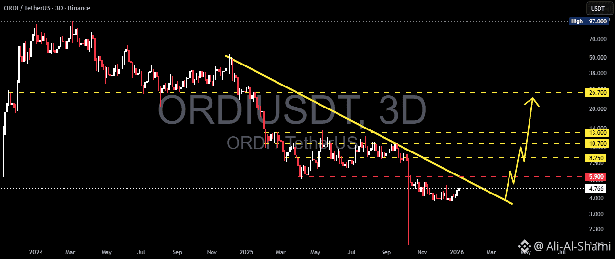 ORDI/USDT لا يزال في مرحلة هبوطية أولية، لكن السعر يتداول الآن في منطقة قرار حاسمة. تعمل منطقة $4.75 – $5.90 كمنطقة معركة رئيسية بين المشترين والبائعين. قد يراقب المتداولون العدوانيون إشارات عكس اتجاه مبكرة، بينما يجب على المتداولين المحافظين الانتظار حتى يتم تأكيد اختراق خط الاتجاه قبل النظر في مراكز متوسطة المدى.