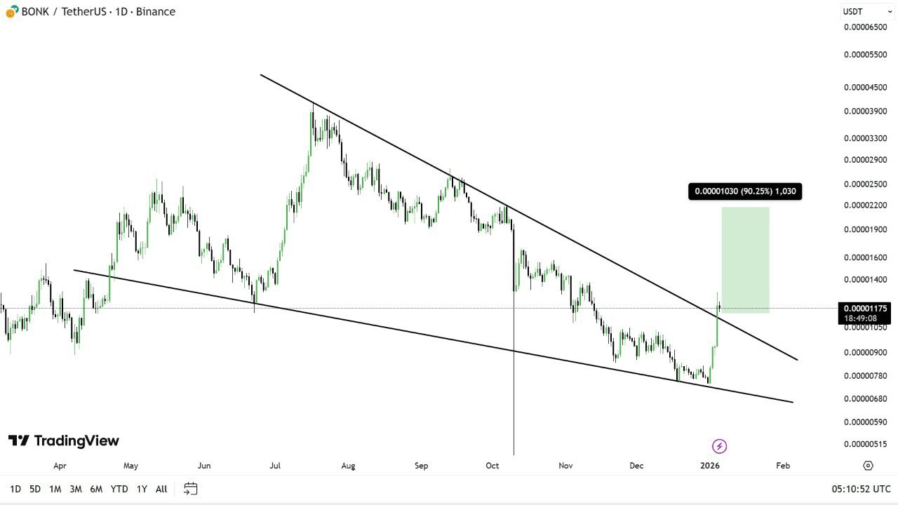 BONK a avut o rupere de succes din modelul de pană 📈 descendent în intervalul zilnic cu un volum frumos.