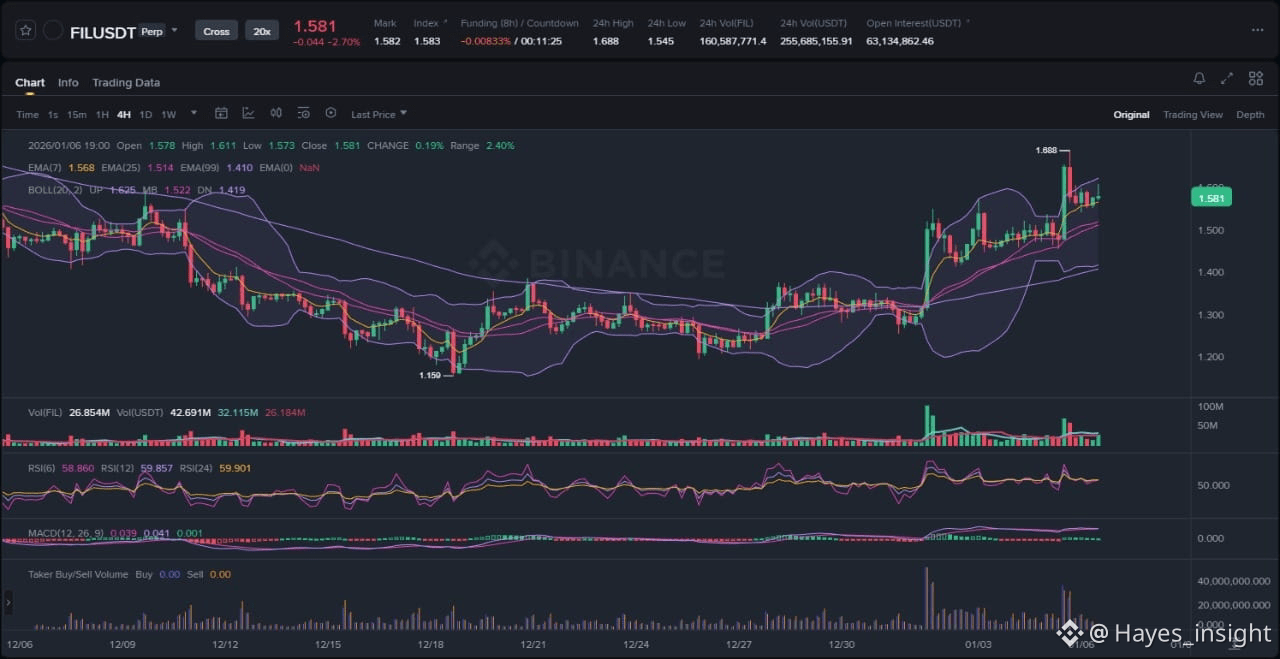 Examining the attached chart, FIL's price structure reveals an uptrend attempt following a period of consolidation. The token is currently trading at approximately $1.59, positioned above the 7-period EMA at $1.52 and the 25-period EMA at $1.48, which confirms short-term bullish alignment. The 99-period EMA sits lower at $1.42, acting as a longer-term support in this nascent recovery. Bollinger Bands show the price hugging the upper band after a volatility expansion, with the middle band (20-period SMA) at $1.50 providing dynamic support. Observable elements include an impulsive move upward from the local swing low near $1.45, followed by a brief consolidation phase that rejected lower prices, and now a push toward the recent swing high around $1.65. This setup suggests a breakout attempt from a multi-week range between $1.40 and $1.60, where the lower boundary has held as support multiple times.