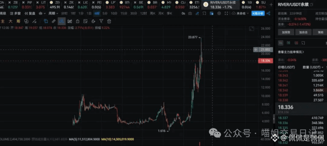 RIVER最高上涨到23.8的位置,再来一根加速上涨针就基本上我们的空单就可以上车了!
