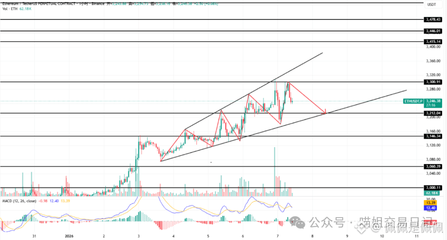 3300阻力以太多次触摸突破失败,3212有个小支撑,同时也是上升趋势线与支撑形成共振,通道内阻力做空支撑做多