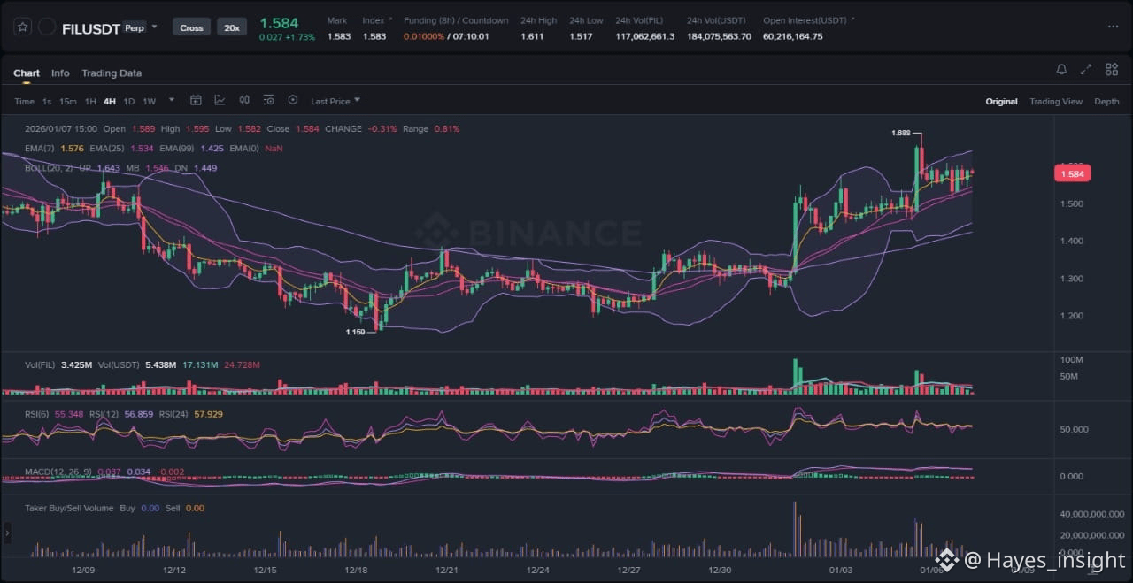 Examining the attached 4-hour chart for FIL/USD, the current structure reveals an uptrend attempt following a prolonged range-bound phase, characterized by a series of higher lows since mid-December 2025. The price has broken above the 25-period EMA at approximately $1.52, with the 7-period EMA providing dynamic support during the recent impulsive move upward. The 99-period EMA, acting as a longer-term trend filter, slopes gently upward from $1.45, confirming the shift from a downtrend to potential bullish continuation. Bollinger Bands have expanded, with the price hugging the upper band near $1.59, signaling volatility expansion and a possible distribution phase if momentum wanes, though the squeeze earlier in the session resolved bullishly.