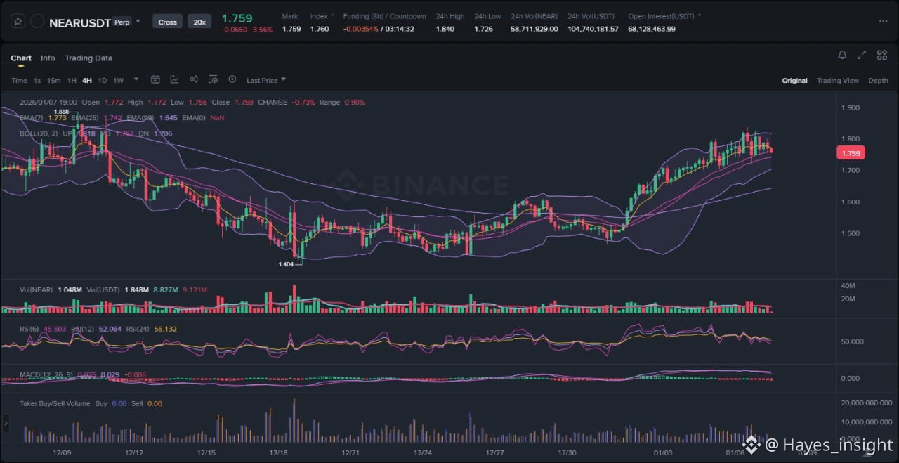 For continuation of the uptrend, NEAR would need to decisively close above the $1.80 resistance on elevated volume, forming a bullish engulfing candle that invalidates the prior rejection and targets the next liquidity pocket near recent swing highs. This scenario gains probability if the MACD line maintains its slope and RSI pushes toward 65 without divergence, potentially leading to a measured move extension toward the upper Bollinger Band projection. An alternative invalidation could occur via a breakdown below the $1.70 support, where a liquidity sweep draws in stop-loss orders before a fakeout reversal, signaling a shift to range-bound trading or deeper mean reversion toward the 99 EMA. In this bearish case, watch for MACD histogram contraction and RSI dipping below 50, which would negate the current structure and suggest distribution by larger holders. A mixed fakeout might manifest as a brief wick above $1.80 followed by a sharp rejection, trapping breakout traders and pulling price back into consolidation—probabilistic at around 30% given the aligned indicators, but requiring confirmation from volume behavior to differentiate from true continuation.
