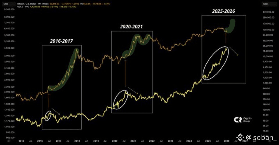 History shows a clear pattern: Gold moves first… Bitcoin follows. 🧐