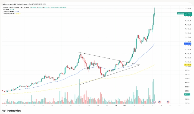 BNB a intrat în sfârșit în vârful său istoric în mijlocul lunii octombrie 2025 — majoritatea monitorizărilor îl înregistrează la aproximativ 1.370 USD, iar CoinMarketCap indică vârful exact la 1.370,55 USD pe data de 13 octombrie, deși TradingView arată o valoare ușor mai mare, de 1.375,90 USD, cu o zi sau două înainte. Momentul a fost electric dacă urmăreai graficele în timp real. După ani de ardere constantă și creștere a ecosistemului, să vezi cum a sărit peste vârfurile anterioare, cum a fost cazul din 2021, a fost... satisfăcător, cred eu. Justificator.