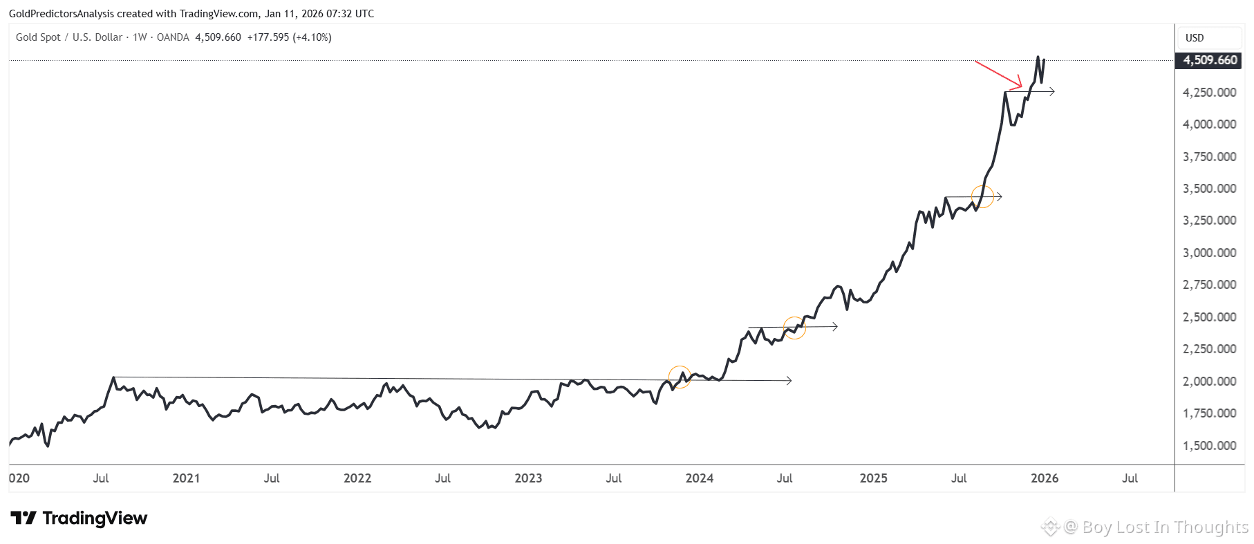 Gold's price action shows a repetitive and powerful pattern: periods of consolidation (e.g., Apr-Jul 2024, Apr-Aug 2025) are followed by strong, sustained rallies.