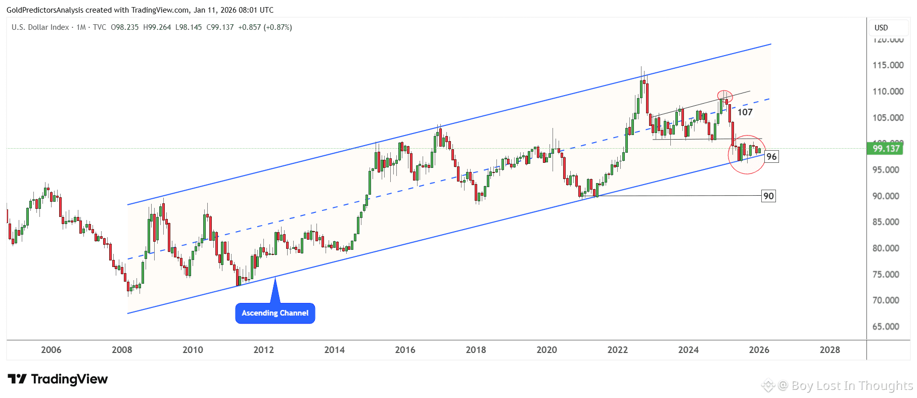 U.S. Dollar Weakness U.S. Dollar Weakness: The Dollar Index is threatening a major breakdown below a long-term channel. A sustained drop below 96 would provide significant tailwinds for dollar-denominated gold.