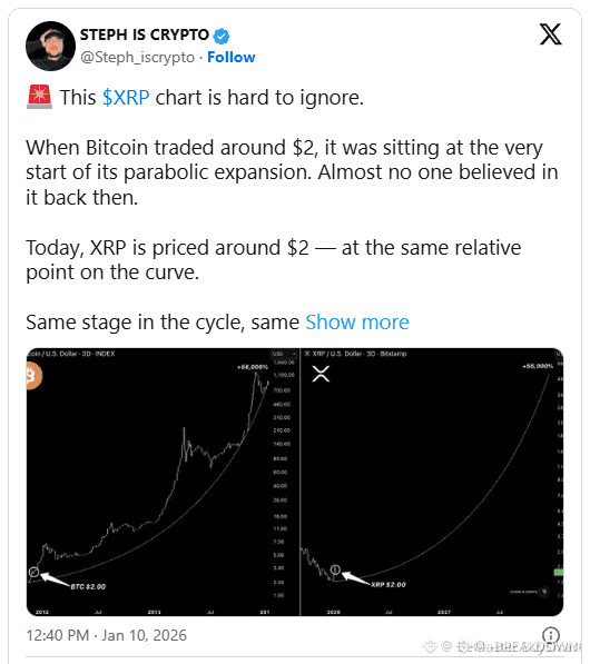 Steph shared a split chart comparing Bitcoin’s early cycle to XRP’s current setup. On the left, Bitcoin traded near $2 in 2012, just before its historic expansion. On the right, XRP trades around $2 in the present cycle. Both assets sit near the base of a rising parabolic curve.