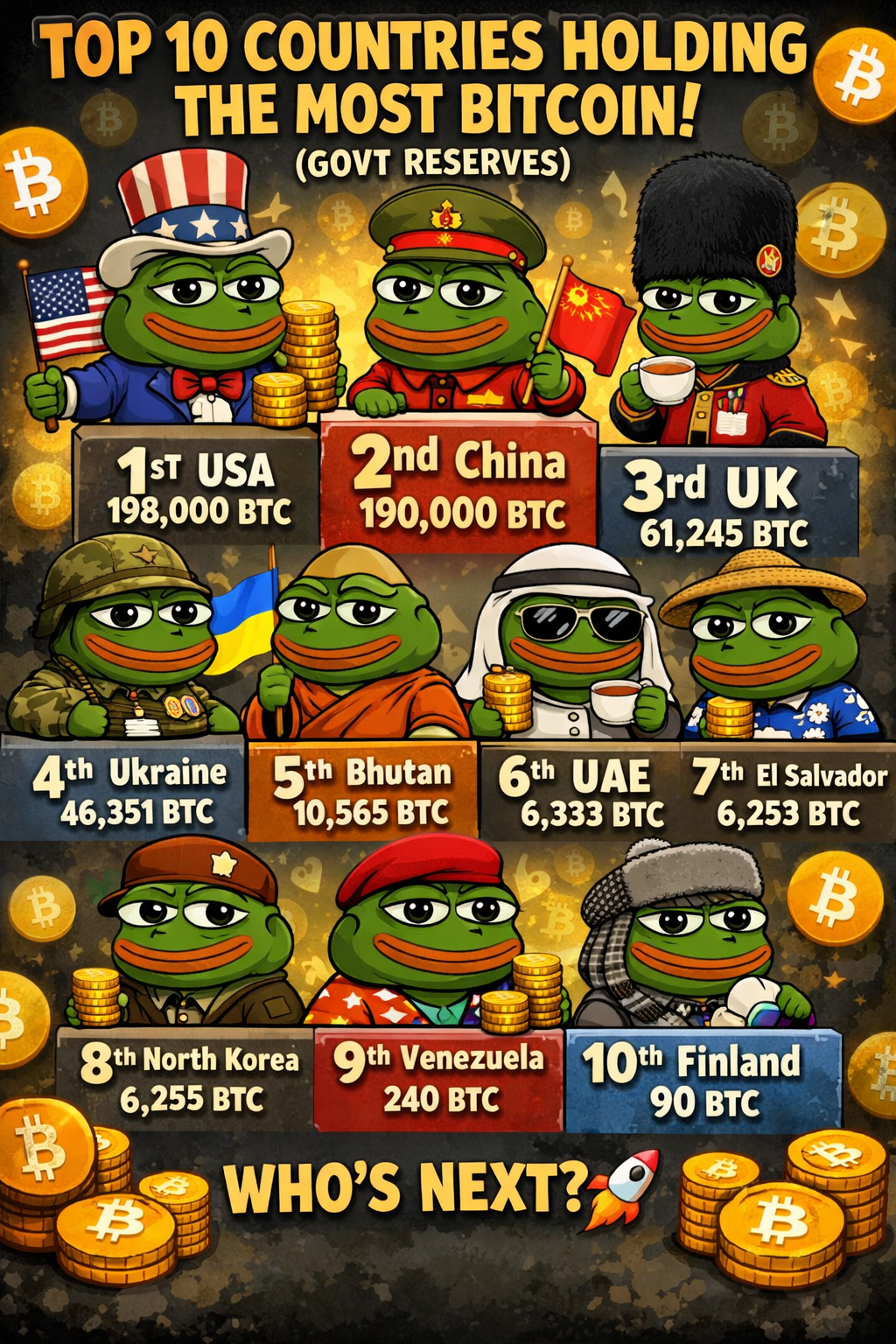 Bitcoin nu este doar pentru indivizi — țările își acumulează sats și ele. În timp, guvernele au adunat BTC prin minerit, confiscări și achiziții strategice. Pe primul loc se află Statele Unite ale Americii, urmate de China, Regatul Unit al Marii Britanii, Ucraina și El Salvador, care a făcut cunoscută Bitcoin-ul monedă legală. Alte deținătoare semnificative includ Germania, Bulgaria, Bhutan, Venezuela și Finlanda.
