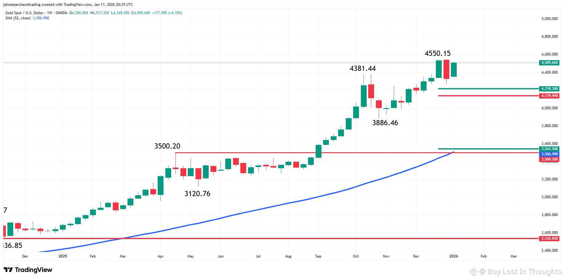 Key support lies between $4,381.44 – $3,866.46, while the 52-week moving average reinforces longer-term bullish structure.