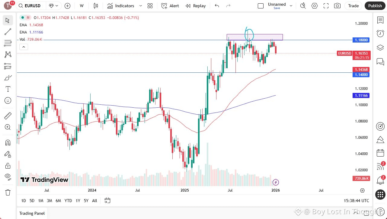 Key Levels: 1.18 (major ceiling) and 1.14 (major floor).