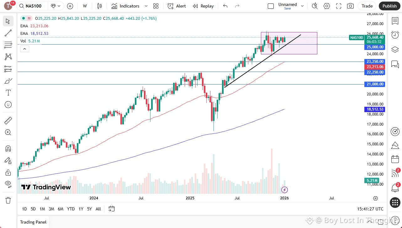 Key Levels: 26,000 is the major resistance to watch; 25,000 acts as support.