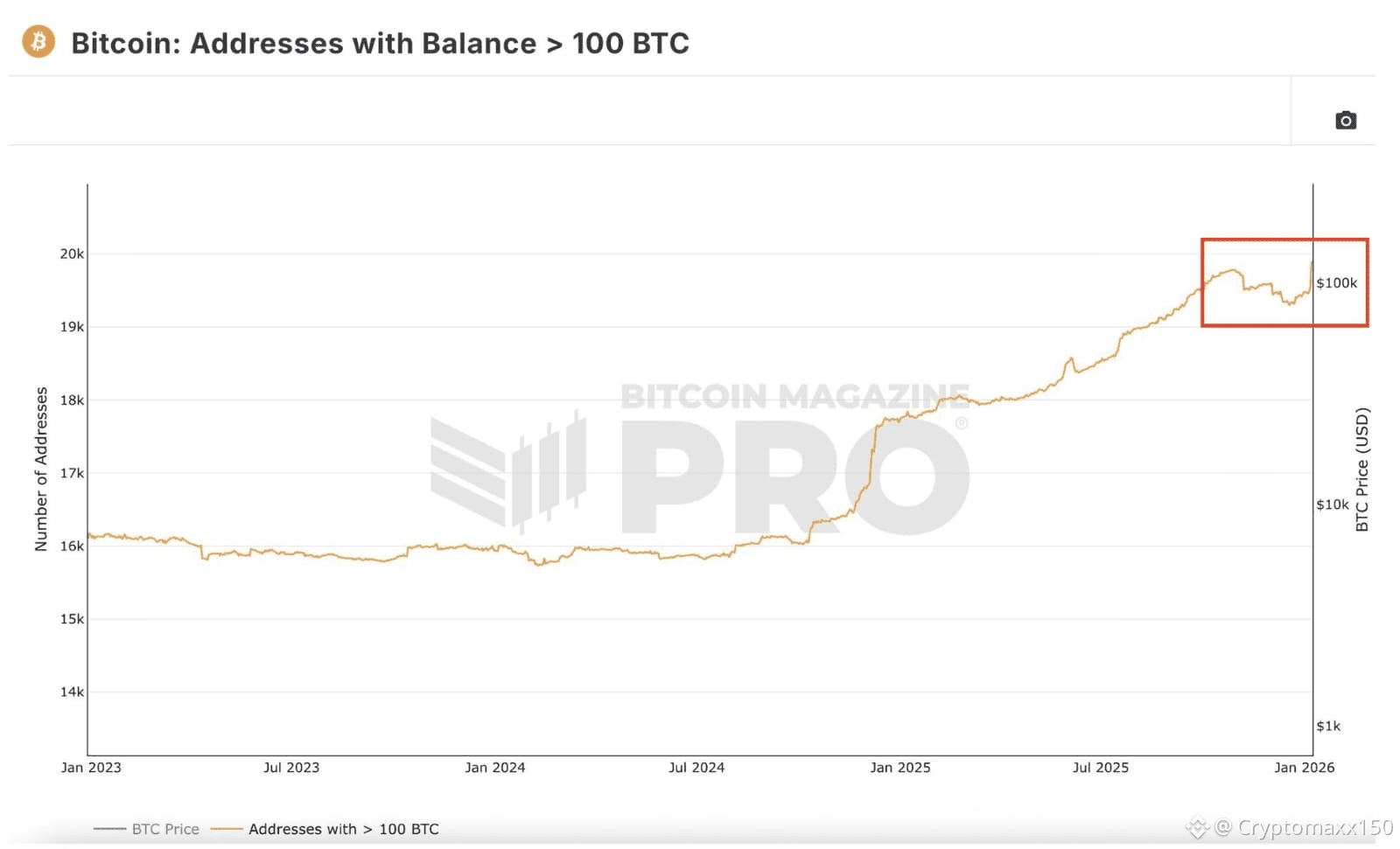 زيادة عدد العناوين التي تمتلك أكثر من 100 BTC غالبًا ما تعكس مرحلة تجميع ذكي من كبار اللاعبين.