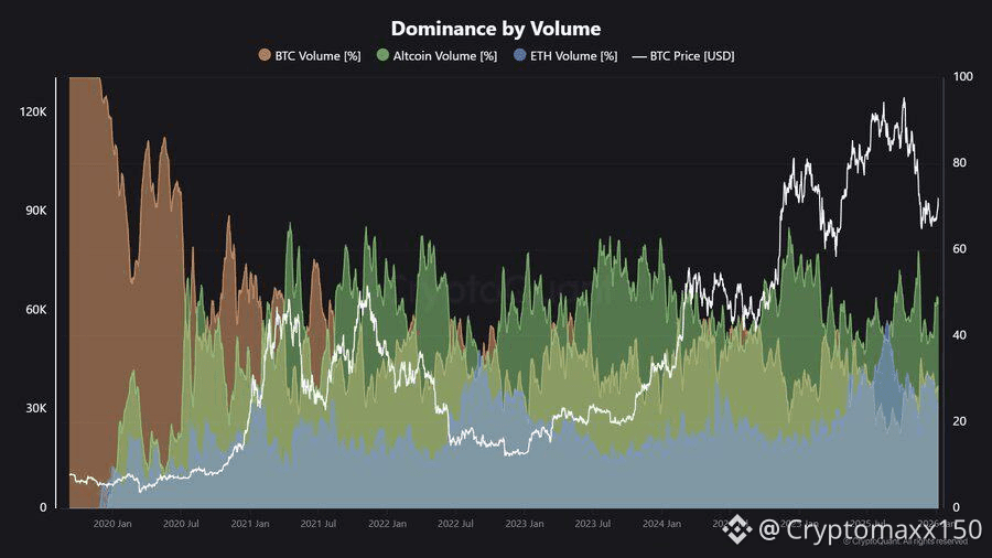 في المرحلة الحالية، بيتكوين ما زال حاضرًا بقوة في قيادة الحجم، ما يدعم سيناريو استهداف مستوى نفسي كبير قبل انفلات البدائل.