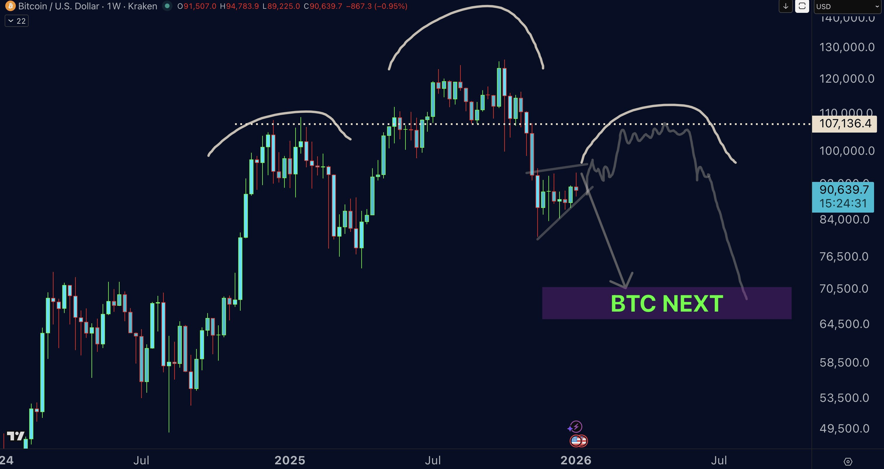 Obiectivul meu principal următor este 70,000. Înseamnă asta că voi face short aici? Absolut nu. Voi crește activ pozițiile short existente în intervalul 115,000 până la 125,000, cu condiția ca prețul să crească în intervalul 97,000 până la 107,000. Așa cum am menționat săptămâna trecută, aranjamentele actuale rămân valabile, fără nicio schimbare.