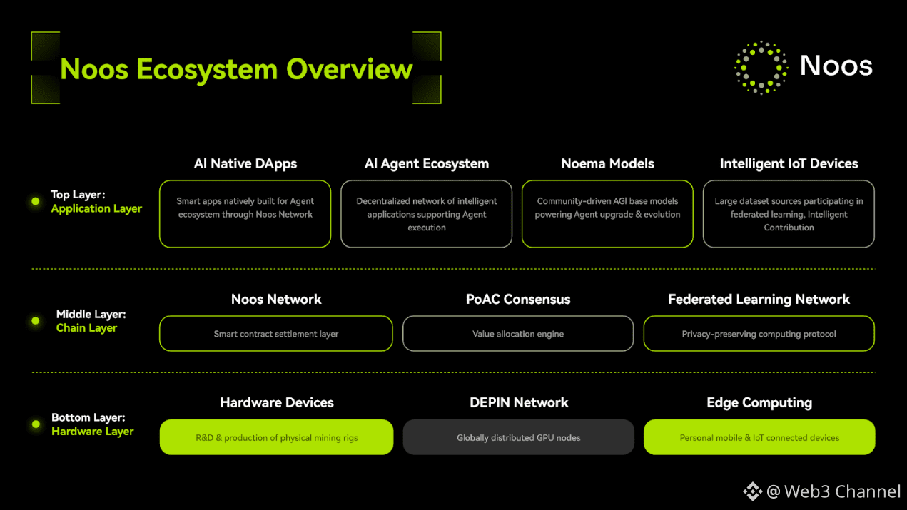 Noos envisions a long-term economic system for silicon-based intelligence—integrating applications, protocols, and hardware into a unified framework that connects data generation, model training, and value distribution.