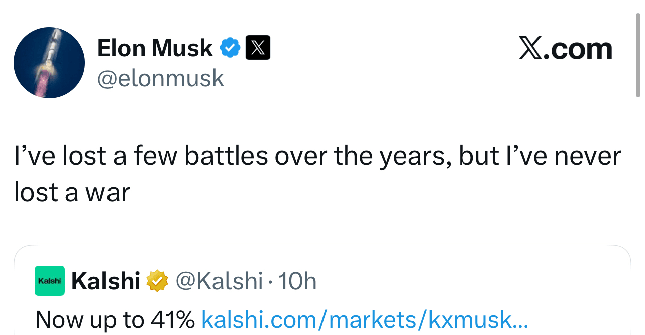• Elon a răspuns direct lui Kalshi pe X: "Am pierdut câteva bătălii în anii aceştia, dar niciodată nu am pierdut o război" 🚀