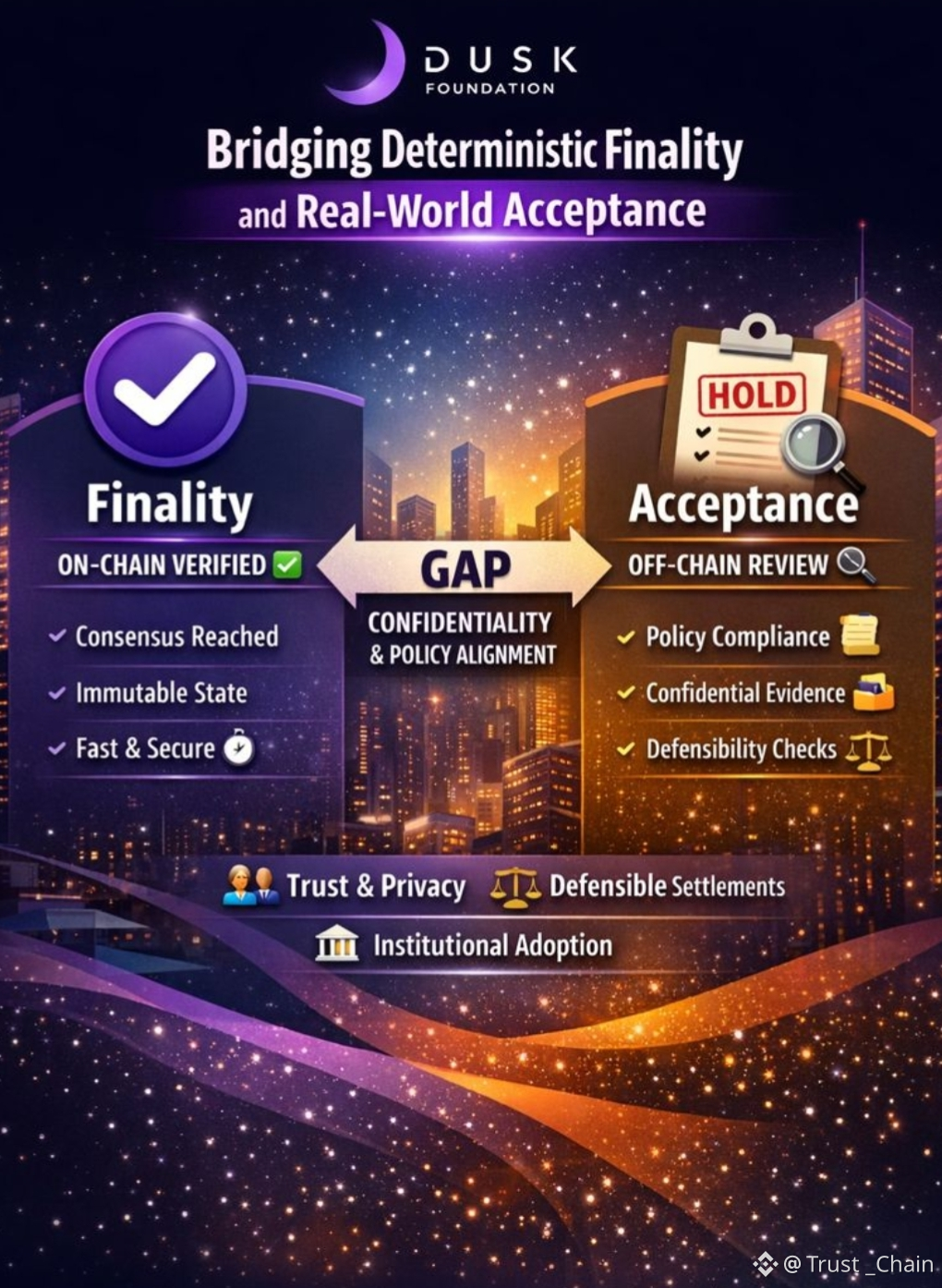However, real-world adoption involves more than technical correctness. Finality confirms execution, but acceptance depends on counterparty policies, compliance frameworks, and operational scope. A transaction can be fully finalized on-chain, yet a venue or organization may require additional verification before treating it as officially “settled.” This is where Dusk’s design shines. Its confidential state transitions enable regulated value to move securely without exposing sensitive data, maintaining privacy while ensuring trust. 🔒