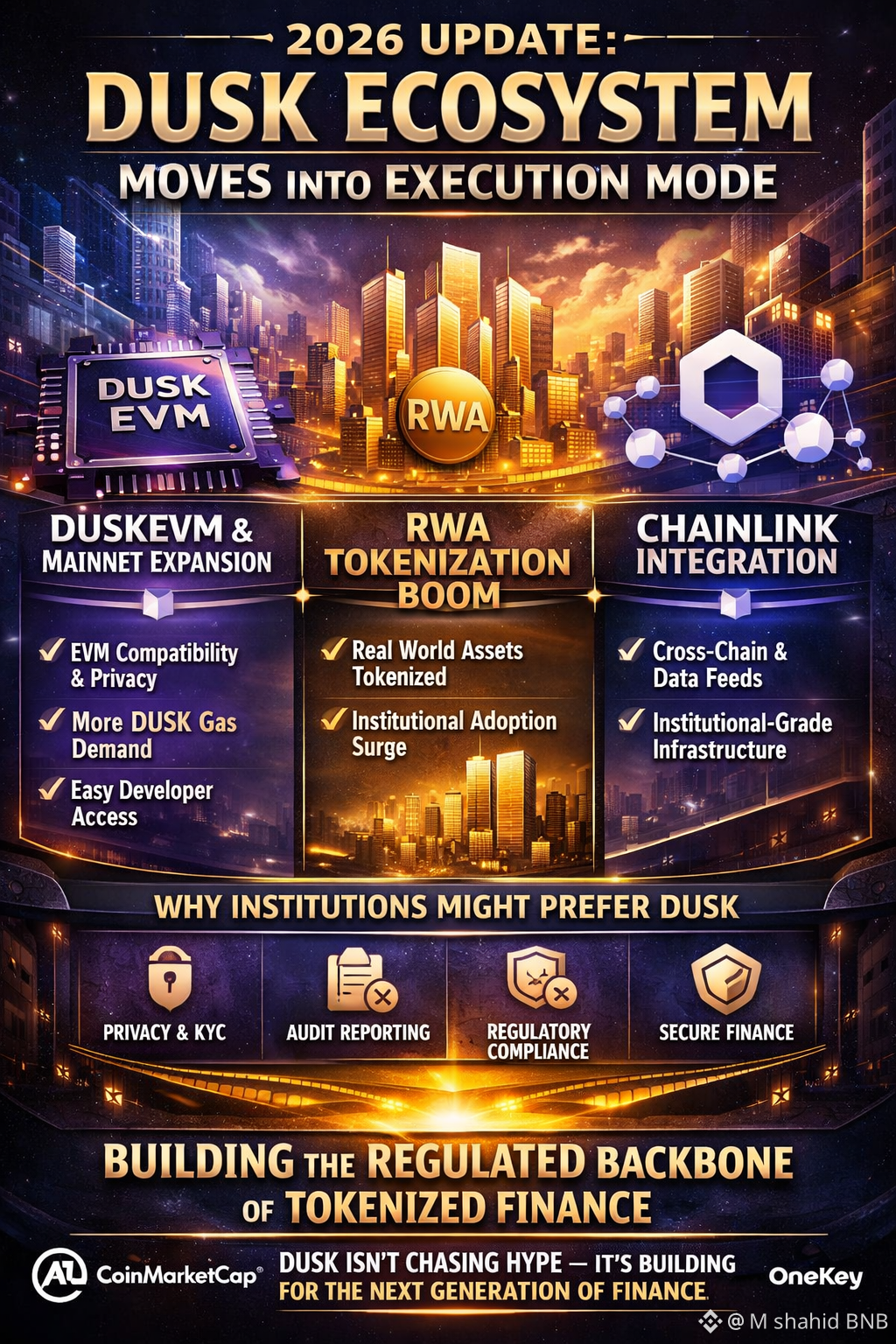 Dusk ne Chainlink CCIP / Data Streams type tooling adopt kiya to support regulated tokenization flows and cross-chain access.