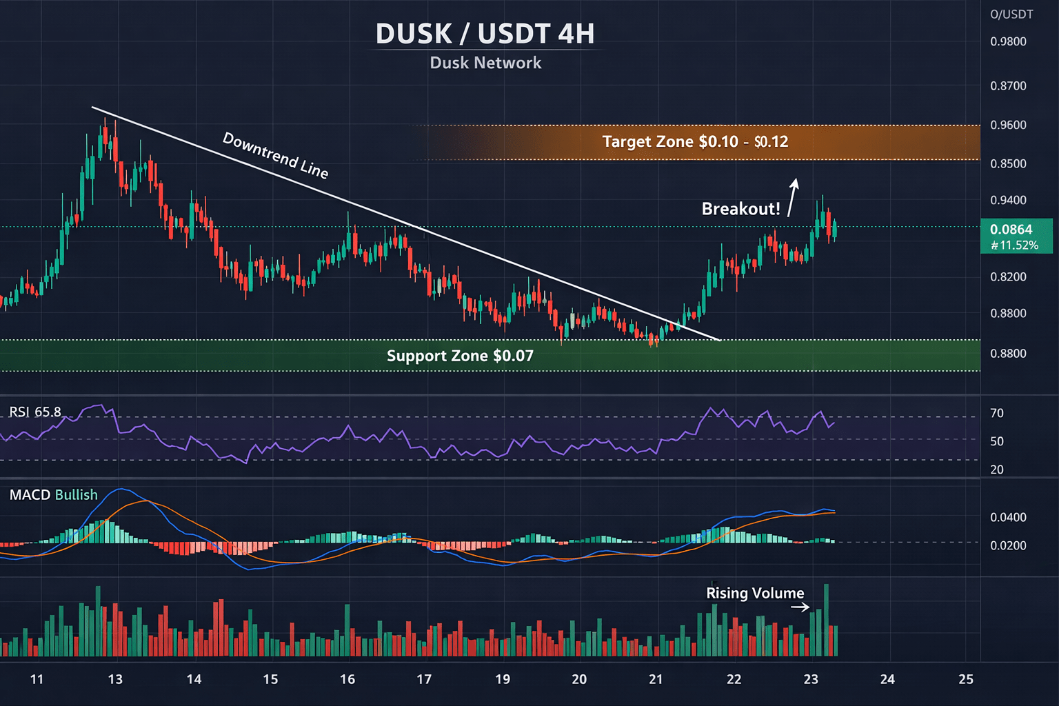 DUSK a depășit zona sa recentă de consolidare cu un volum în creștere. Această mișcare sugerează o participare în creștere și o posibilă schimbare a impulsului pe termen scurt.