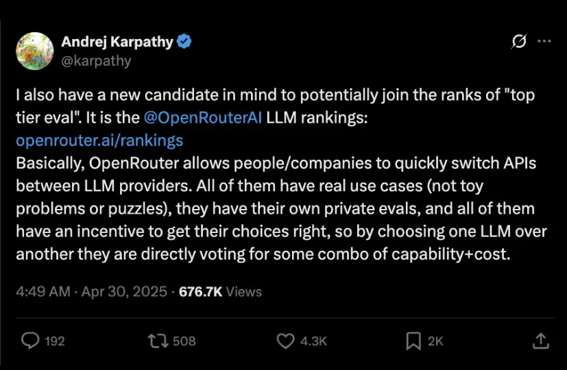 Aceste date au creat cel mai autoritar clasament LLM din industrie, chiar și Andrej Karpathy l-a recomandat public. În aprilie 2025, OpenAI a ales chiar să lanseze anonim testul GPT-4.1 pe OpenRouter pentru a obține feedback de la dezvoltatori fără părtinire.
