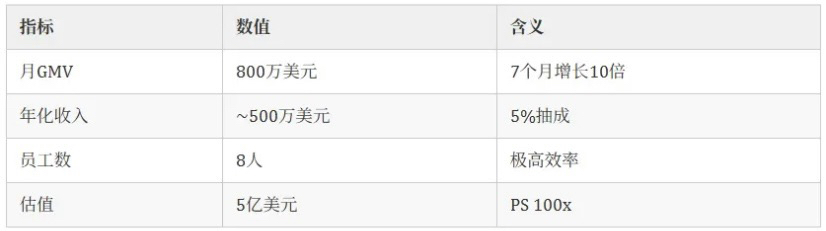 O echipă de 8 persoane a realizat o valoare anuală de aproape 100 de milioane de dolari GMV, cu o eficiență comparabilă cu cea a Instagram-ului în etapele sale timpurii. Dar dacă se poate menține o evaluare de 100 de ori PS, depinde de capacitatea de a construi rapid efecte de rețea înainte de a fi atacat de open source.