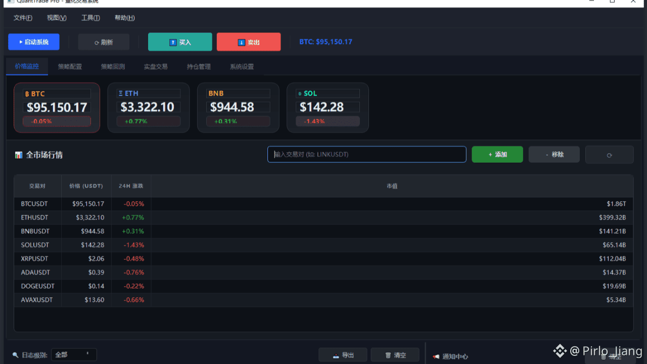 - 📊 Monitorizare prețuri în timp real - Binance piață în timp real- 📈 Testare strategii - Validarea efectului strategiilor pe date istorice- 💹 Tranzacționare automată - 8 moduri de gestionare a pozițiilor- 🎨 Interfață multi-tematică - 7 scheme de culori profesionale- 🔔 Notificări de semnal - Telegram/email