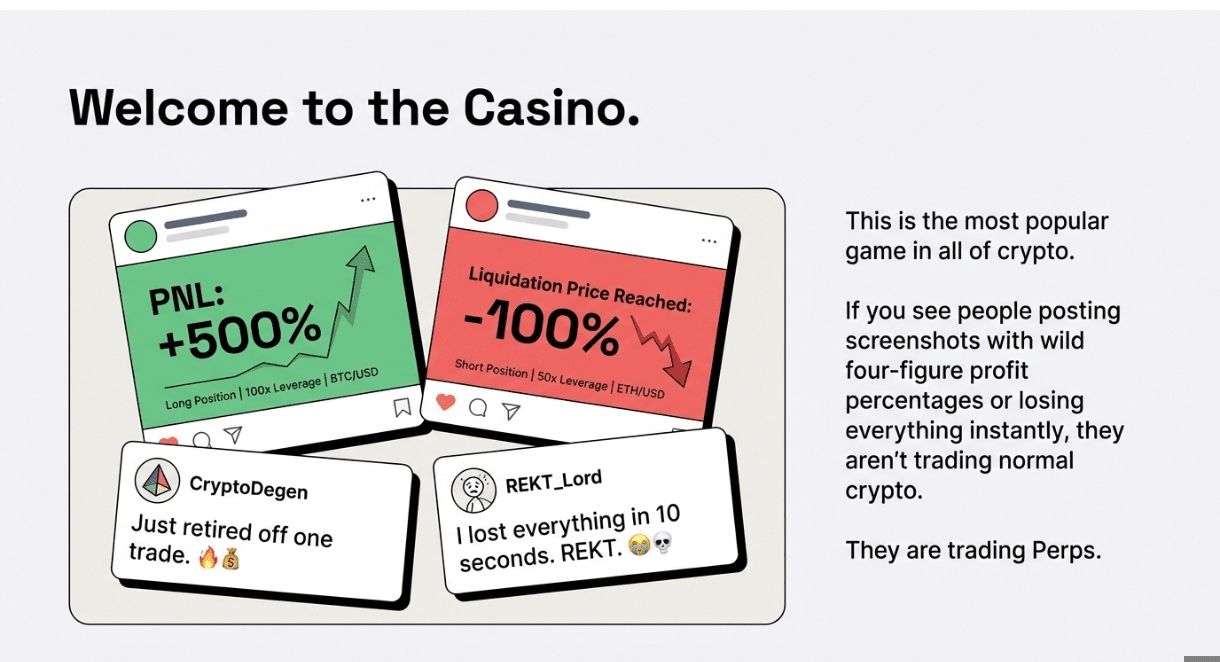 Bro, acesta este probabil cel mai popular joc de casino din toată cripto. Dacă vezi oameni postând capturi de ecran cu "+500% Profit" sau "REKT -69%," ei fac trading cu Perps. Noice 😜