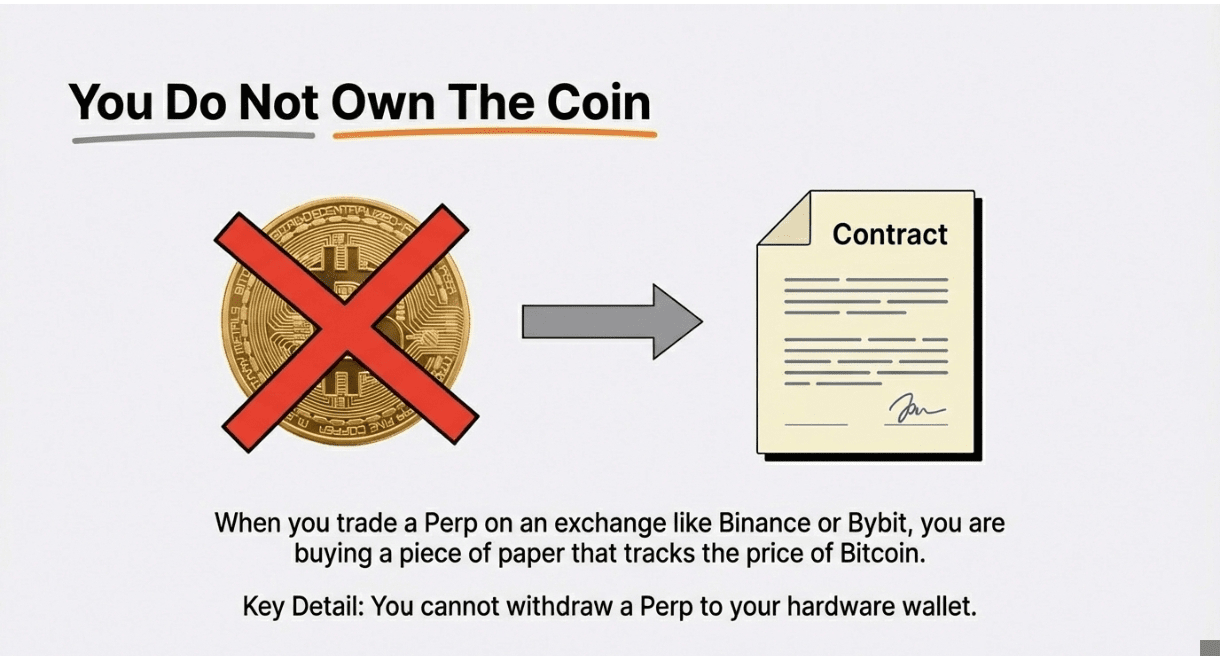 Fără proprietate: Nu cumpărați Bitcoin. Cumpărați o bucată de hârtie care urmărește prețul Bitcoin. Nu puteți retrage un Perp în portofelul hardware.